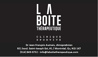 La clinique sportive La Boite thérapeutique offrant des services de santé varié tel que la chiropratique, physiothérapie, ostéopathie, acupuncture et la massothérapie nous soutient gracieusement.